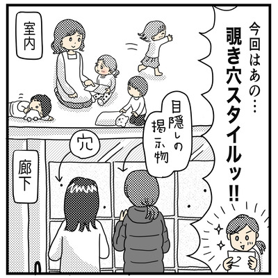 2019年02月09日 17:52 妹の保育参観その2 「うちのヒフミヨ!兄たちはますます妹びより」より抜粋(紙書籍はモノクロです)大抵の子にはバレてなさそうでしたがやっぱり中には勘の良い子もいてチラチラ覗き穴の方を観察する子も(笑)けどまだお喋りがそれほど達者じゃないせいか友達同志で一緒に怪しんだりしないの カテゴリ : 長男ヒー コメント数 : 0 コメント