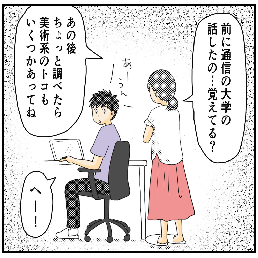 第三者の視点でみると通信制美大について話すのは『こういう選択肢もあるよ』という提案よりもむしろ『(お母さんは)ここがいいと思うよ(だけどあくまで決めるのは自分でお願います)』っと誘導してるように見えてしまいました。どうしてmotokoさんはそんなに長男くんに絵をやらせたいんたろう?こだわるんだろう?って思っちゃい