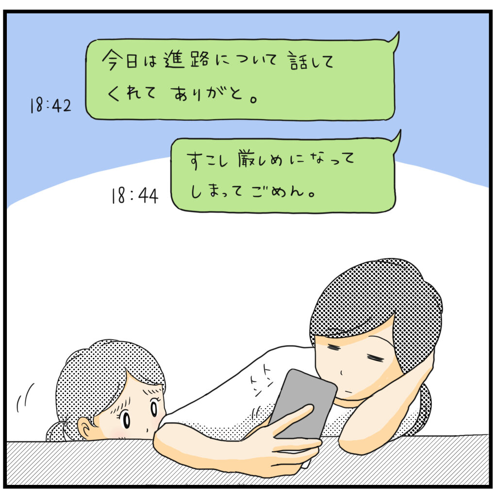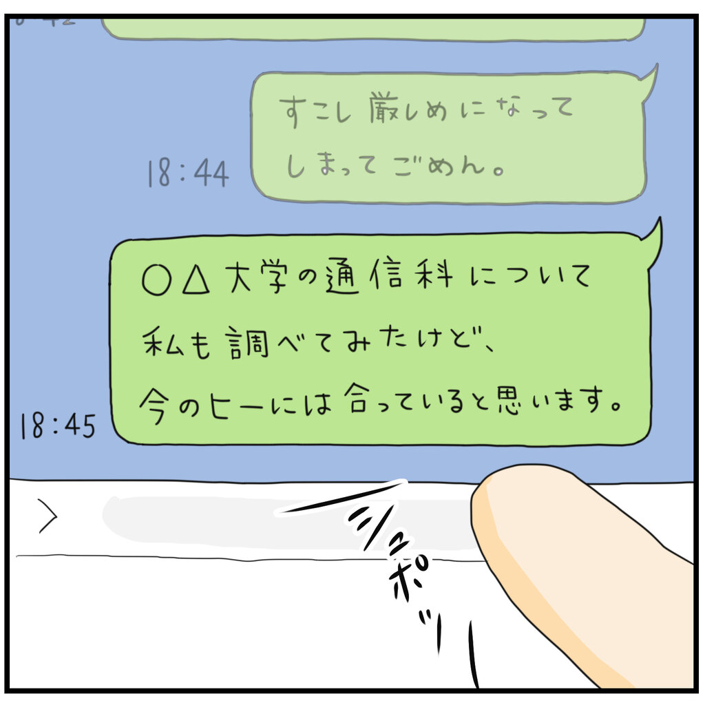ひーくん同様、進路の話をしたあと家族に大反対され家を出て、友だちと出かけている時に父からメールが。内容は、先程の謝罪と父の考え、どういう選択をしてもずっと味方だということが書かれていました。電車の中でしたが嬉しくて泣きそうになったのを、10年以上たった今でも覚えています。その後も大きな決断をするときは、そのメールの言葉に幾度となく励まされました。