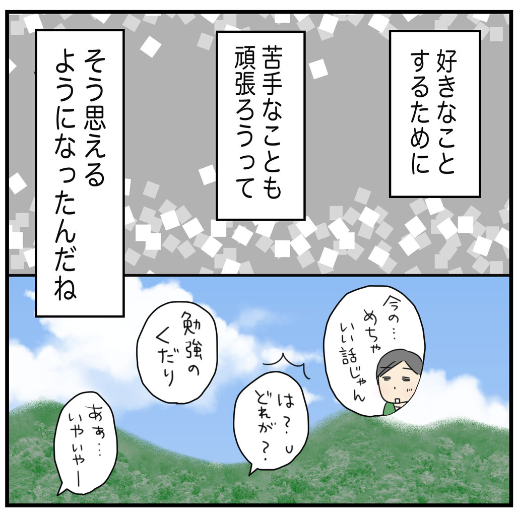 しかし、私はヒーくん自身のプライバシーを心配しています。このエピソードの冒頭でMOTOKOさんが息子さんから許可をとった事を記載しておりましたが、自らの意思をあまり親に出さない息子さんが、本当に快く許可をしたのだろうかと、とても疑問に感じています。進路のお話を見る限り、ヒーくんはとても周りに気遣いのできる息子さんなんだろうなぁと感じました。そのぶん、お母さんが自分の話を書きたいと言ったら、例え嫌でも素直に描かないでほしいとは言わず、(お話でもおっしゃっていたように)”やりたいならやればいい