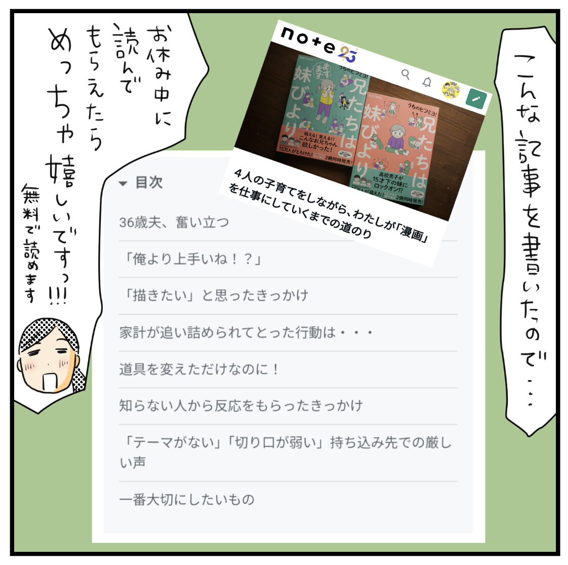 ▼こちらから読めます😌このnoteでは、そんなわたしが4人の子育てをしながら、どんなきっかけで漫画を描きはじめ、仕事にしていくかまでの道のりについて書きました。