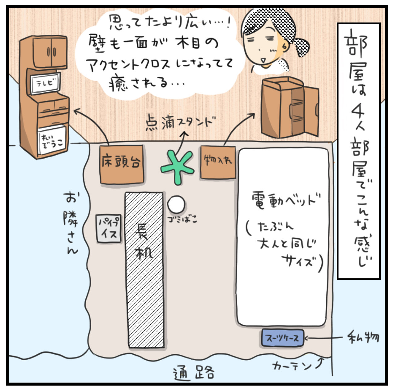 うちの子もよく入院するのですが2人部屋でもカーテンはしてますが隣の方と当たりそうなくらいきゅうきゅうでした。