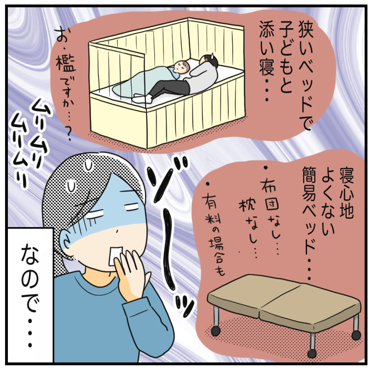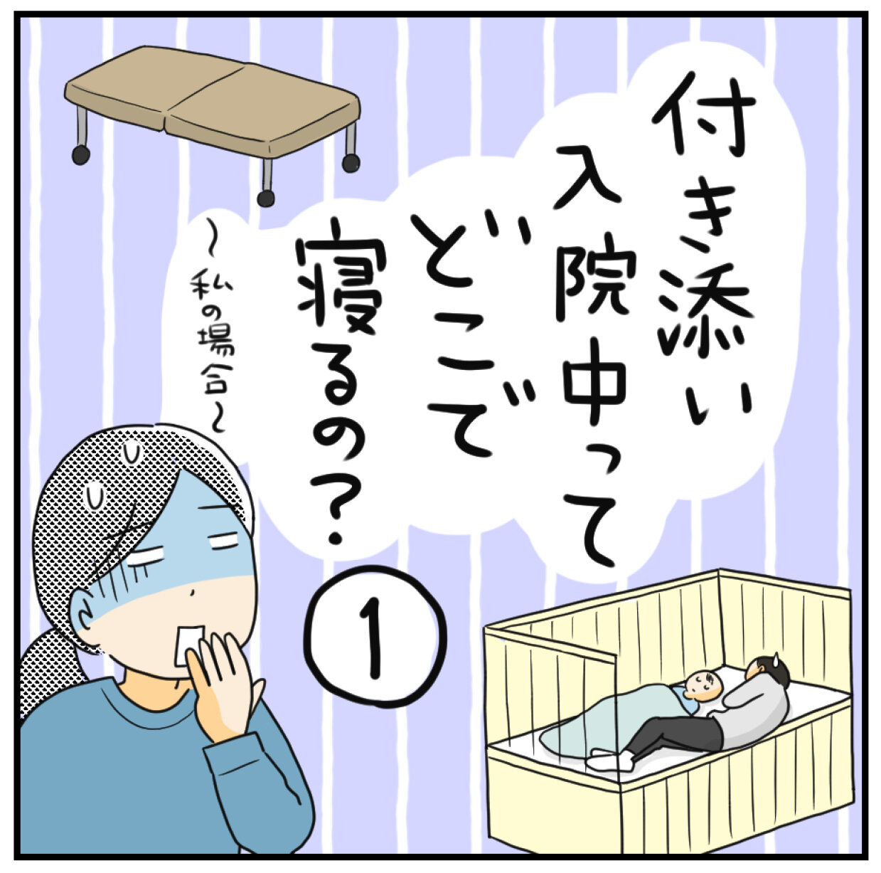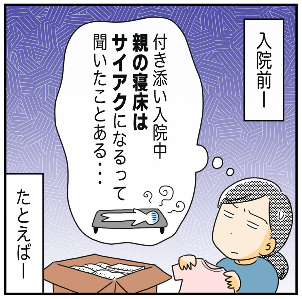 睡眠は息子と共に柵付きのベッドで寝ていましたが、点滴等につながれている息子が動くと絡まったりして、それが心配であまり寝られませんでした💦