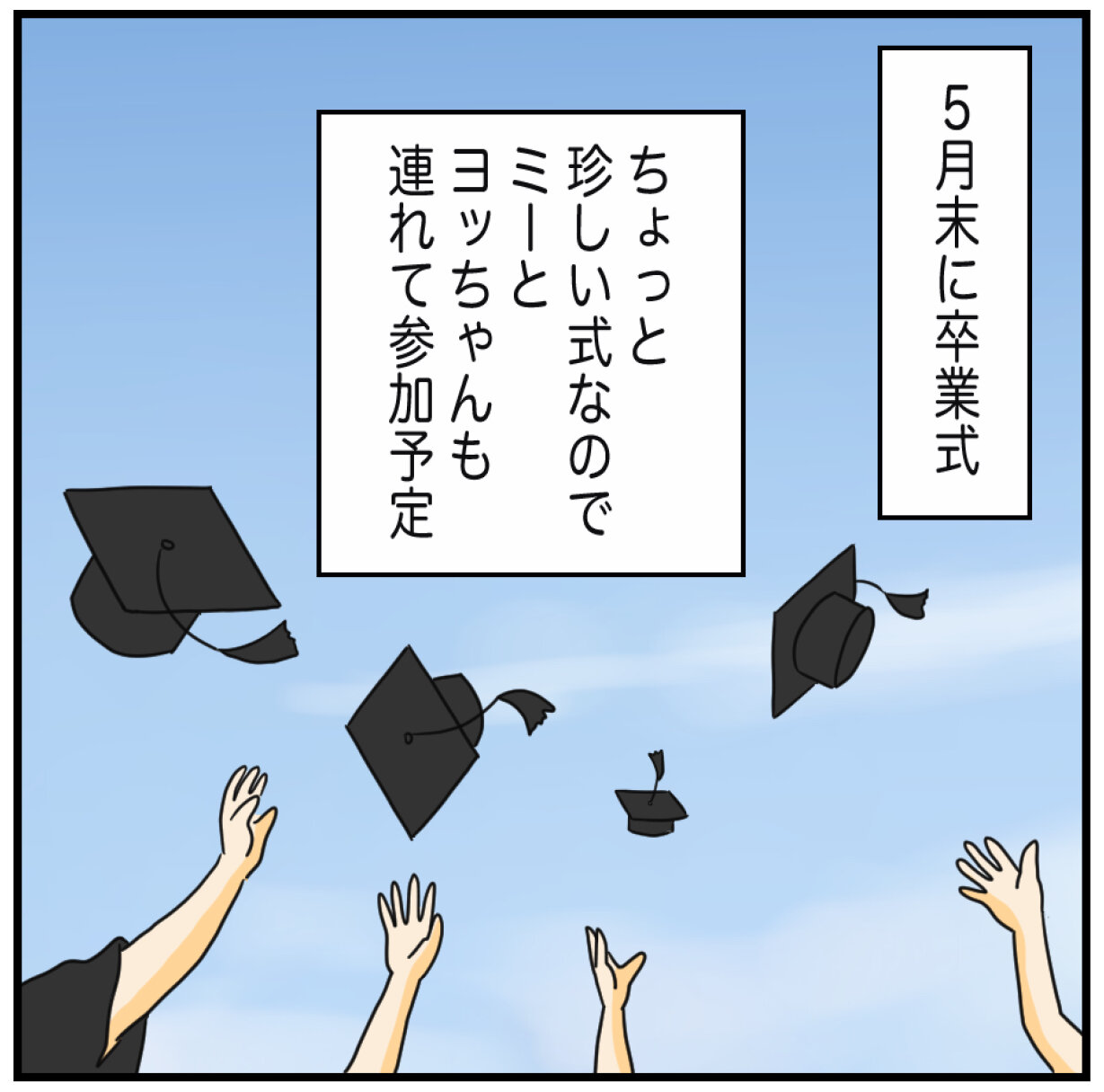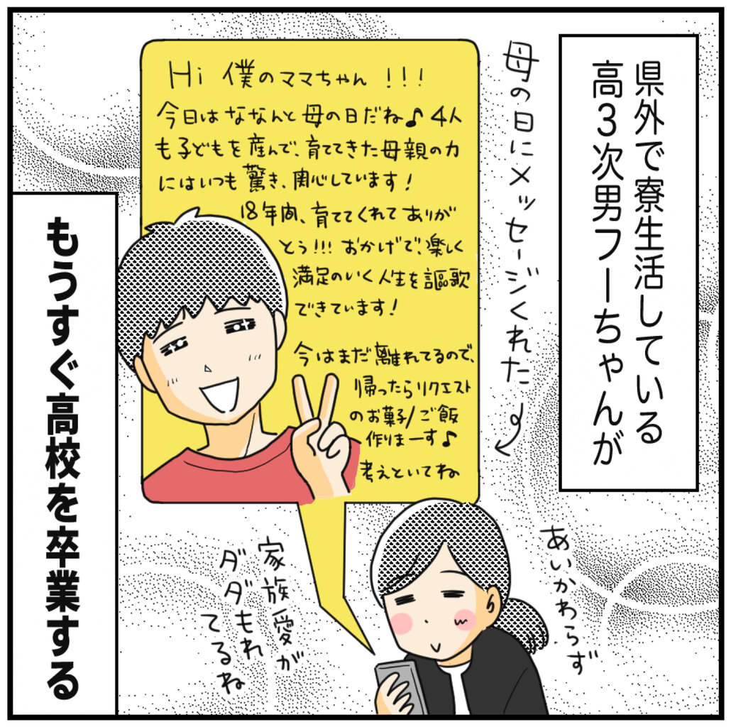 2025年05月16日 16:49 次男フー、もうすぐ高校卒業! あいかわらずのツンデレ女子…!◇さびしいけど、「留学したい!」という長年の夢を自分で実現させたフーちゃん!良かったね!!!▼ここだけ日記(文章)平日毎日更新中 ▼アプリでブログ記事の更新通知を受けとる①こちらをクリック②ライブドアアプリをダウンロード、③「うちのヒフミヨ!」をフォローぜひぜひご登録お願いいたします♪書籍好評発売中です▼Amazonはこちらうちのヒフミヨ! 兄たちは妹びより (コミックエッセイ)MOTOKO祥伝社2019-08-31▼楽天はこちらうちのヒフミヨ! 兄たちは妹びより [ MOTOKO ] 「次男フー」カテゴリの最新記事 < 前の記事次の記事 > コメント コメント一覧 (2) 2. みみ 2025年05月17日 13:58 わー!!この前高校生になったような気がするのにー!!!早いですねぇ〜♪この先、もっともっと楽しみなことがたくさんですね!フーちゃんがんばれー!!! 3. 1 2025年05月18日 13:18 卒業おめでとうございます! 早いものですねえ そしてアメリカに…!立派…! このブログにコメントするにはログインが必要です。 さんログアウト この記事には許可ユーザしかコメントができません。 コメントフォーム 名前 コメント 評価する リセット リセット 顔 星 投稿する 情報を記憶